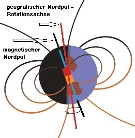 Wie Du in diesem Bild siehst ist der magnetische Nordpol und der geografische Nordpol nicht an der gleicher Stelle.