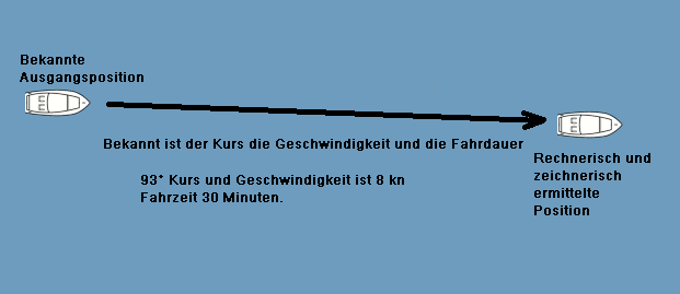 Du fährst 30 Minuten lang mit 8 Knoten. Das sind 4 sm. Du zeichnest einen Kurs von der bekannten Position in Richtung 93° mit der Länge 4 sm.
