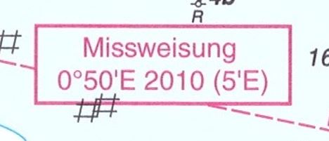 Wie Du weisst ändert sich die Position des magnetischen Nordpols ständig. Um das zu berücksichteigen gibt es den Wert in der Klammer. Für jedes Jahr zählst Du 5'E (5 Minuten) zu der allgemeinen Missweisung dazu.